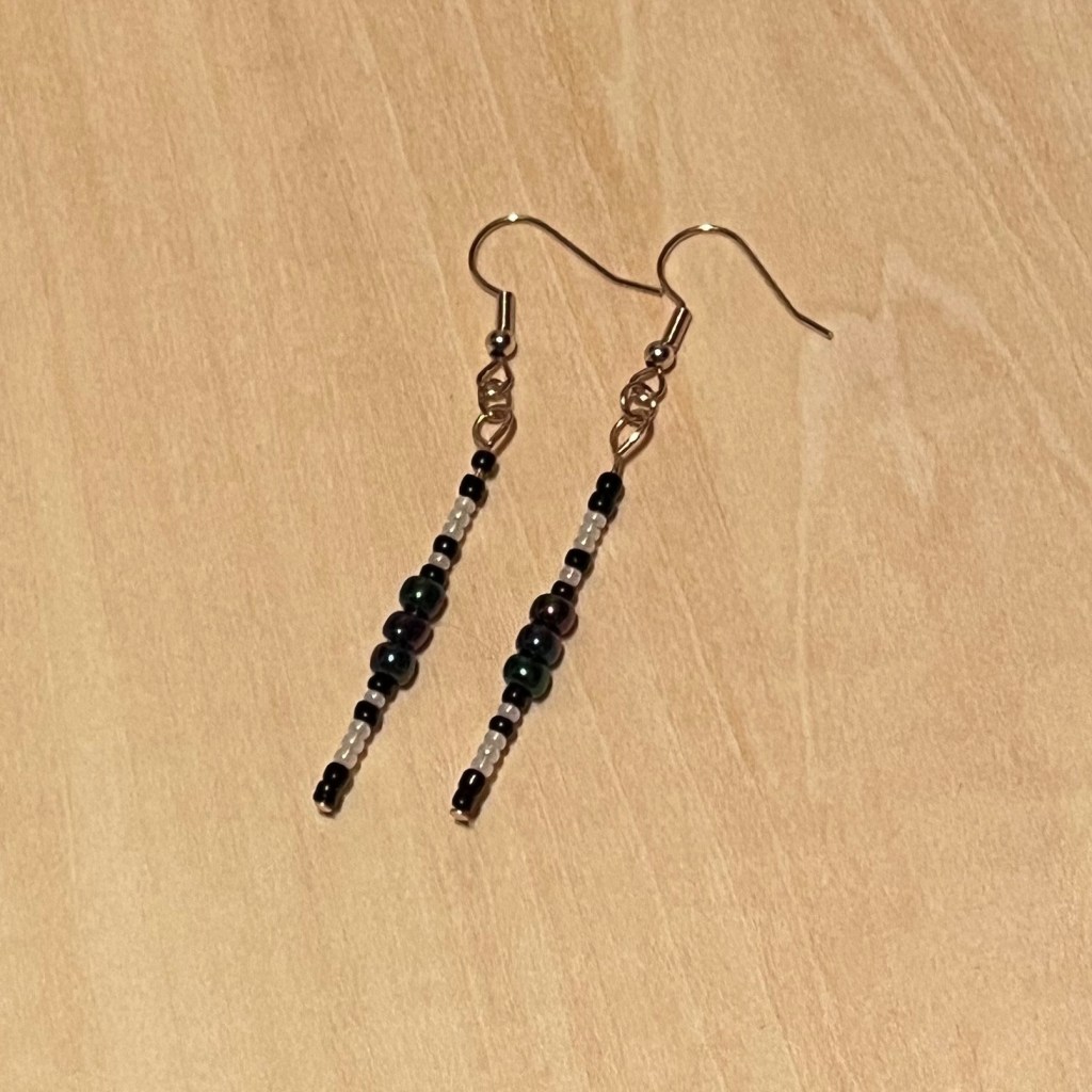 These pairs of earrings are all made with size 12.0 glass seed beads. The Black & Turquoise, Cone & Feather Earrings also feature size 6.0 glass seed beads.