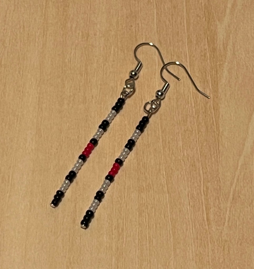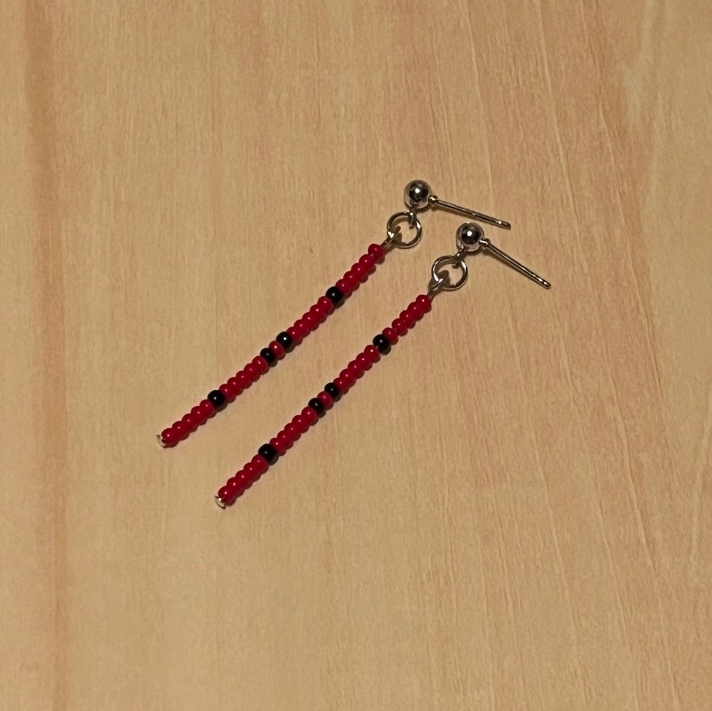 My Stick Earrings are made with glass seed beads, either size 6.0 or 12.0. Size 6.0 beads are larger than size 12.0 beads.