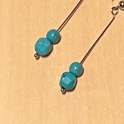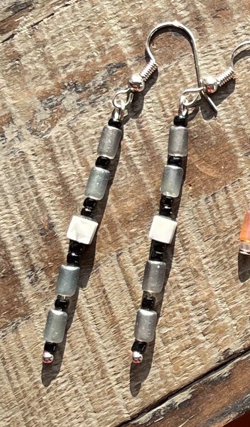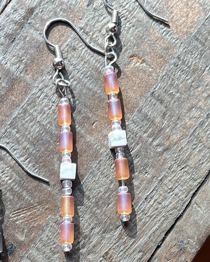 These stick earrings feature square Howlite stones and glass tube beads. Two colours to choose from!